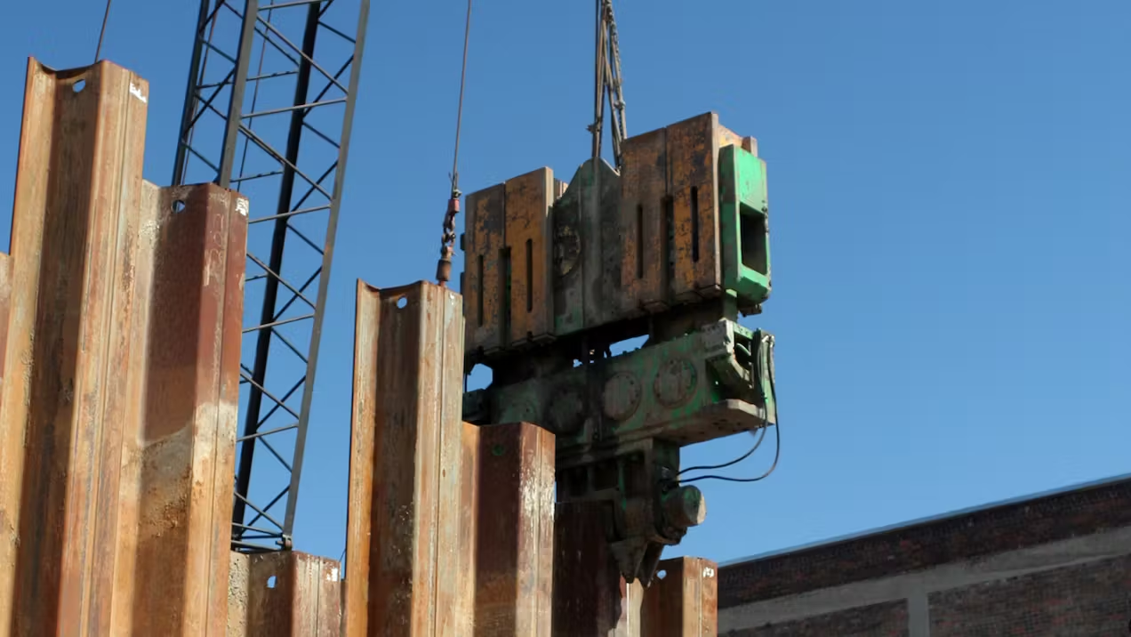 打桩机允许工作人员将重达数千磅的金属板振动到地面上,为建筑物打下坚固的地基。这将限制成品患者护理区域的噪音和振动。